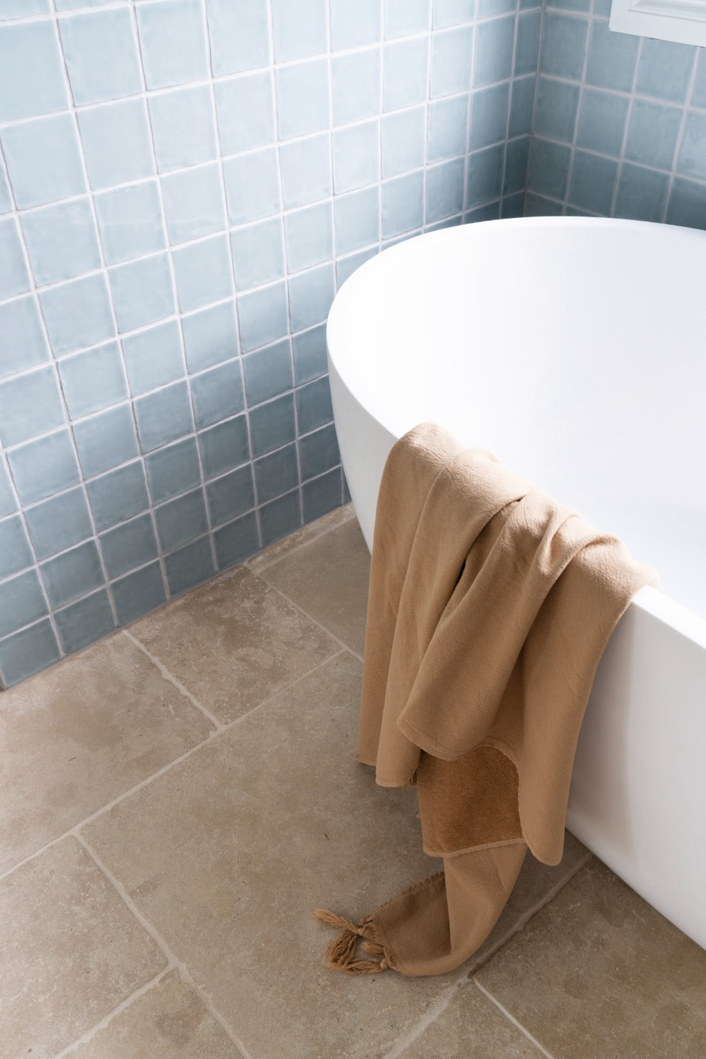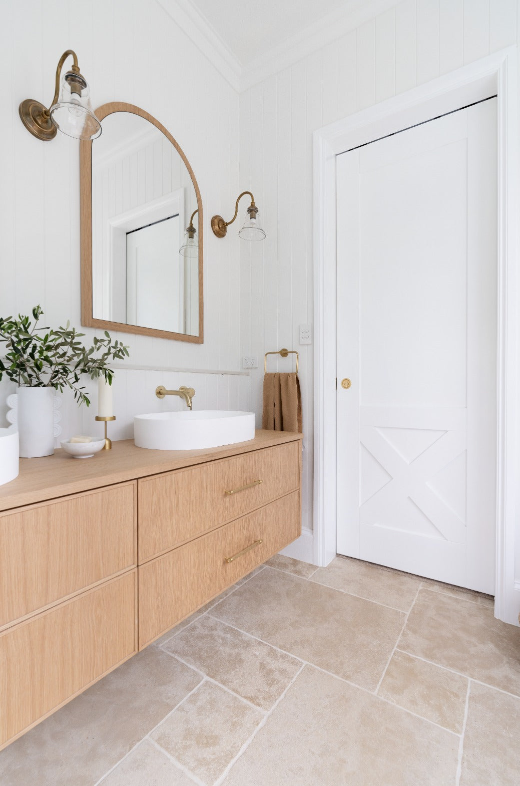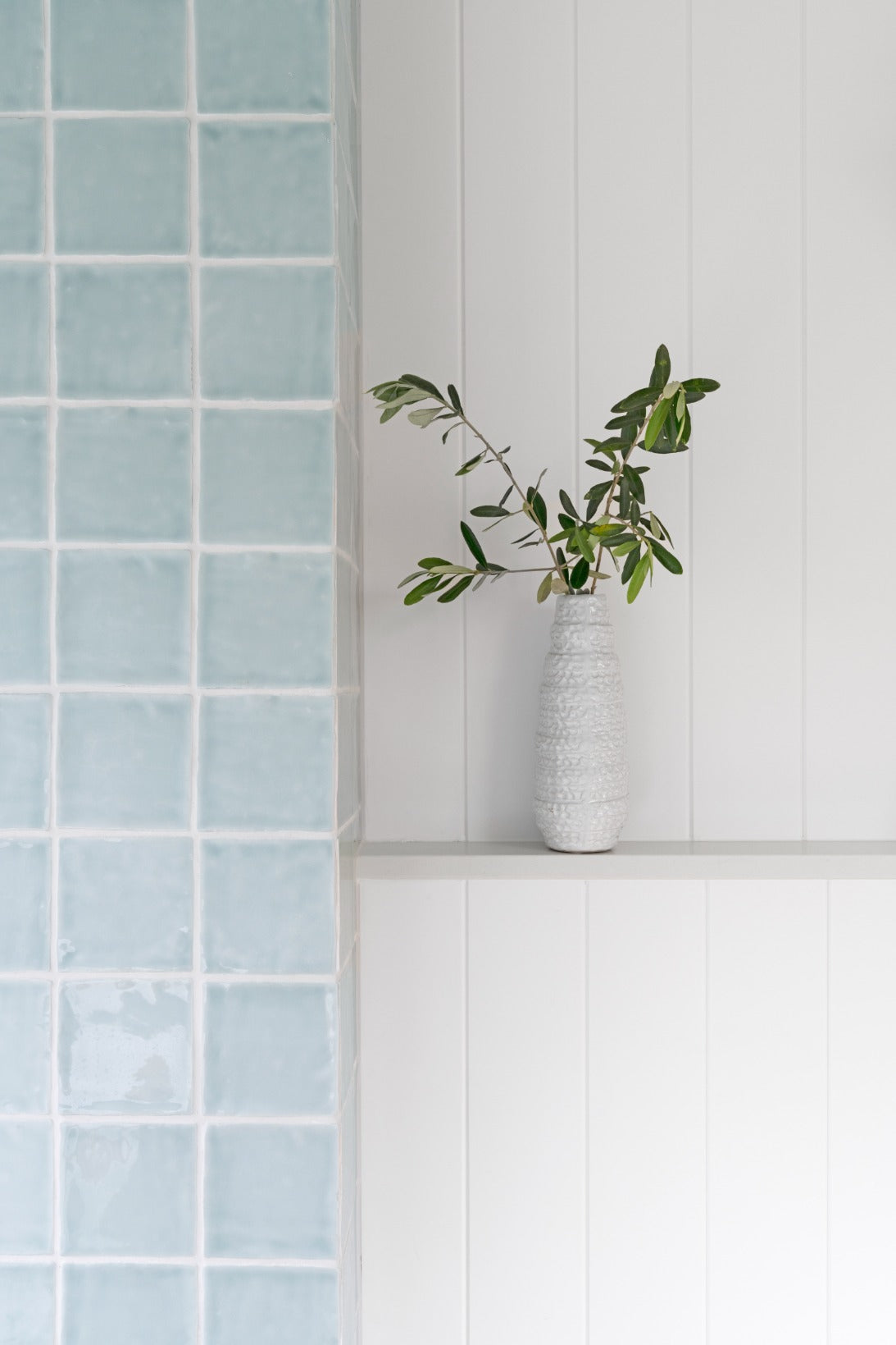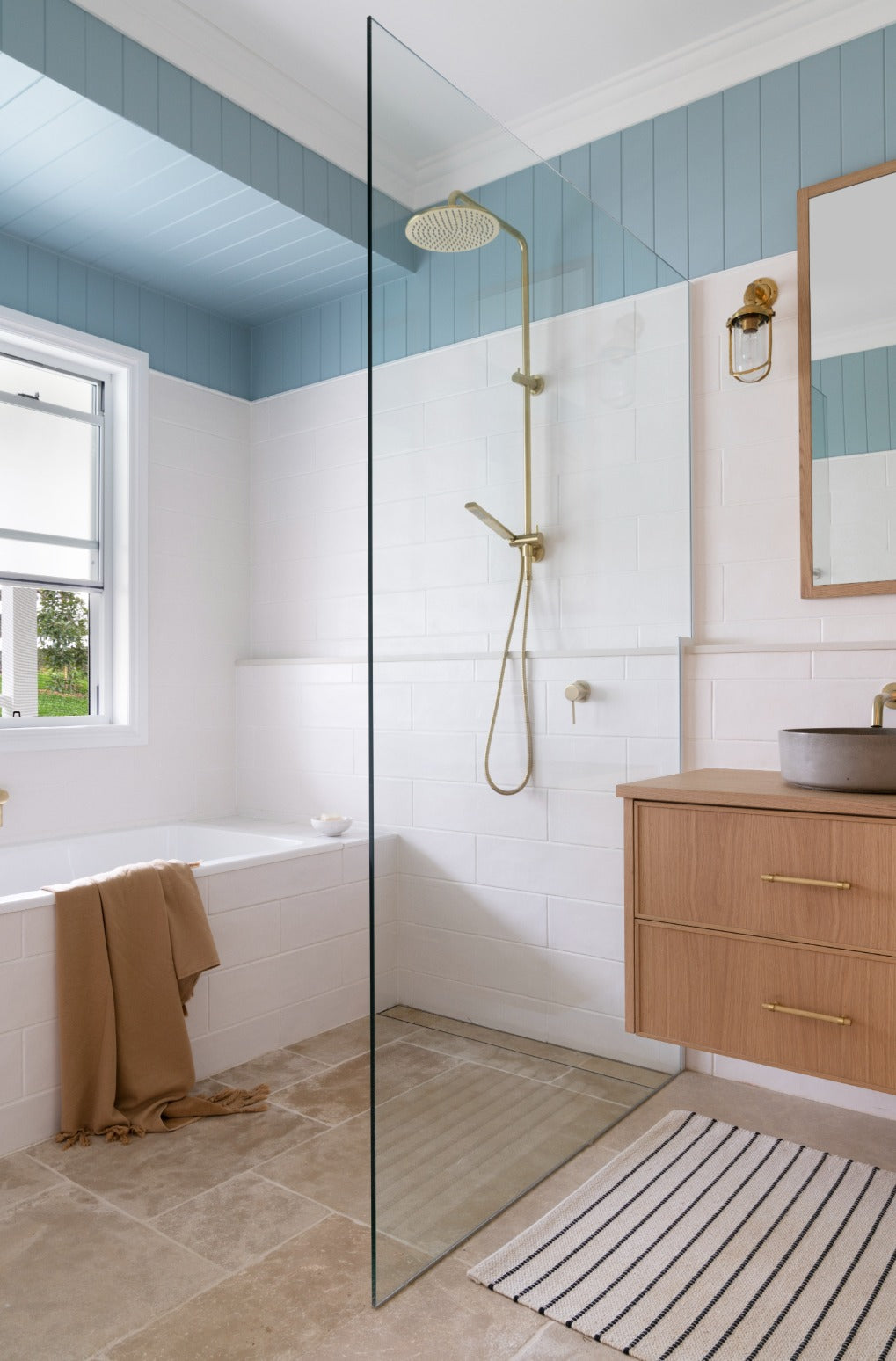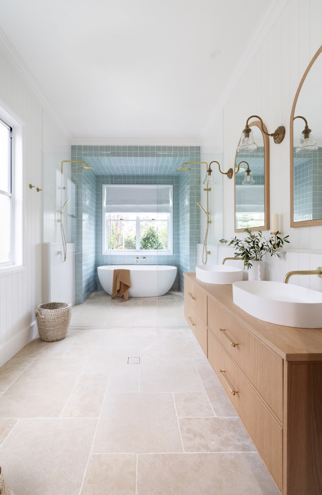 The Master Ensuite exudes a spa-like ambiance, blending organic-edged French Limestone Pavers with soft blue wall tiles and crisp white VJ throughout the space.