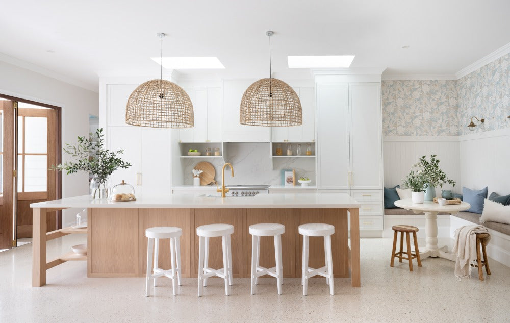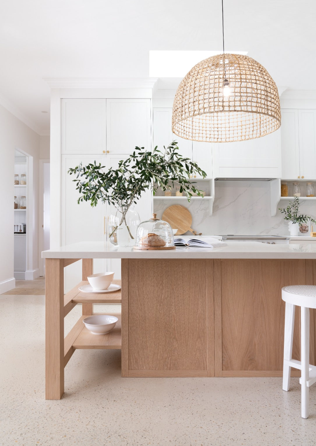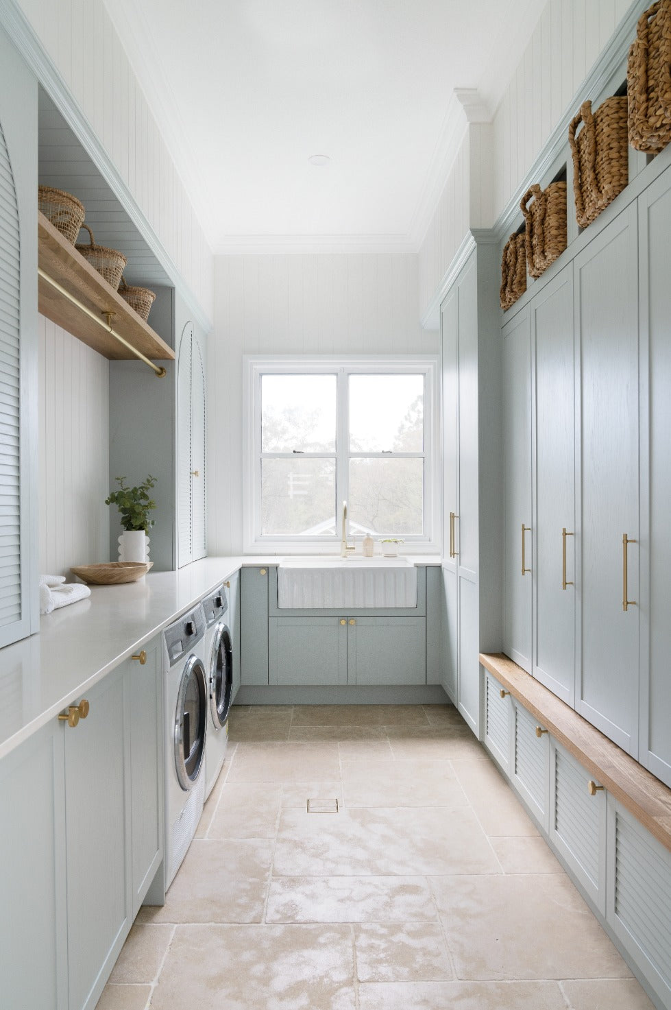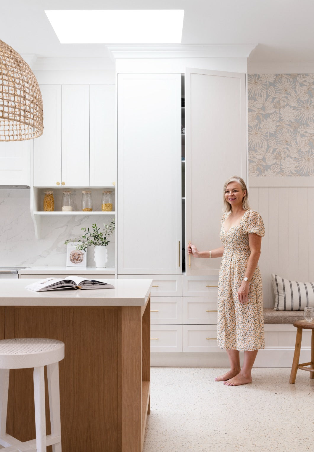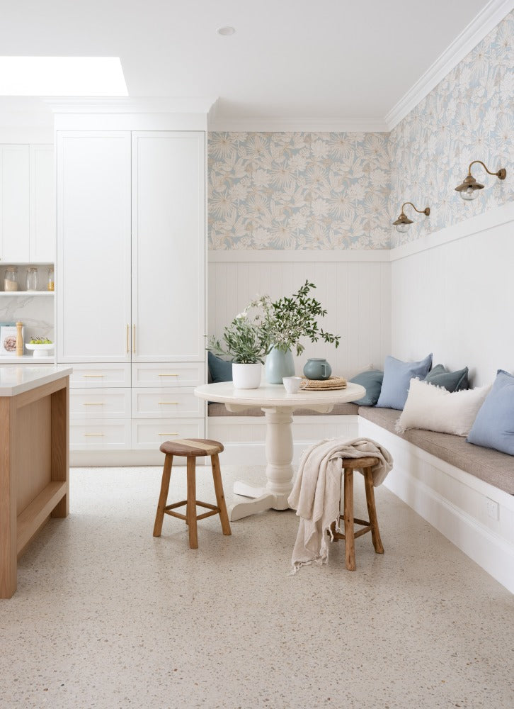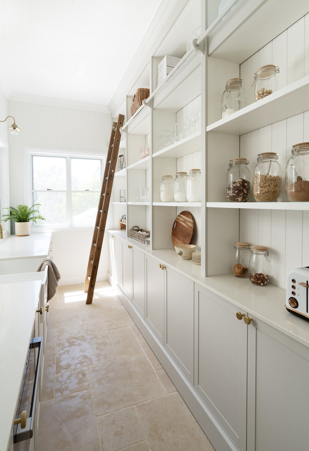 The open-plan kitchen, living, and dining room with its coastal farmhouse look and feel, serves as the heart of the home with a gorgeous adjoining feature butlers pantry and separate laundry with combined mudroom.