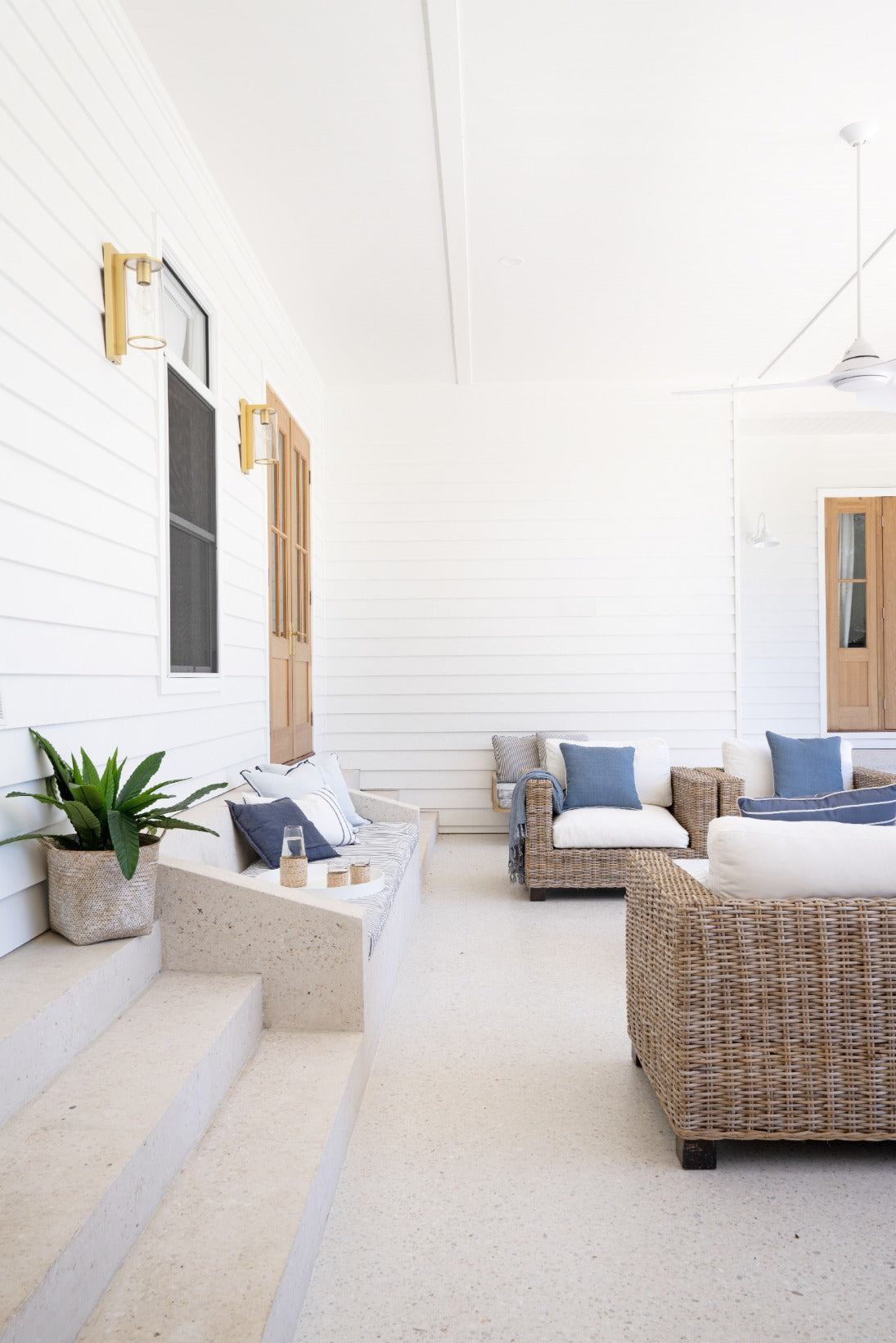 The alfresco space showcases a custom-designed daybed crafted from the same white polished concrete used in the kitchen and alfresco floors