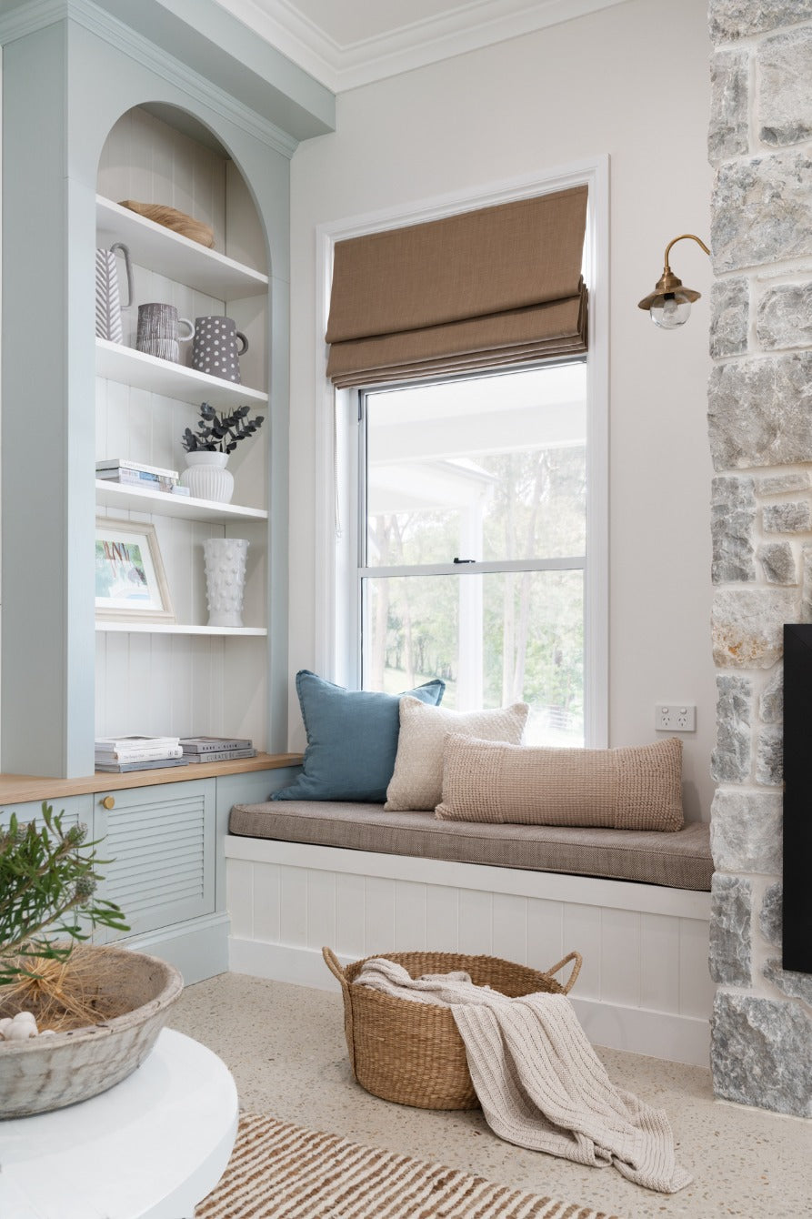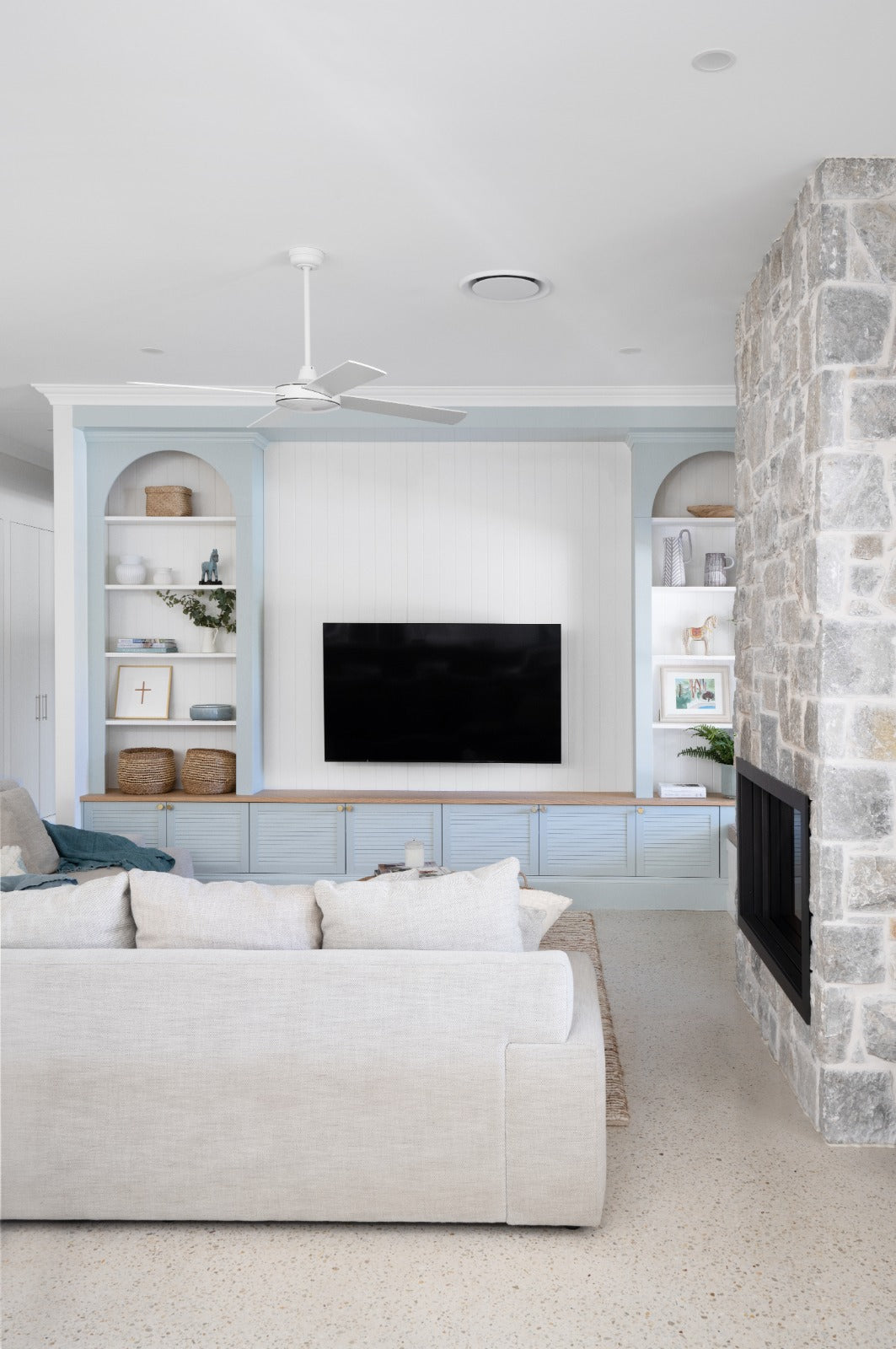 The open-plan living room features a beautiful wood-burning fireplace adorned with coastal stone cladding. Additionally, a custom-made wall unit adds to the charm, featuring louvred door fronts and arch details.