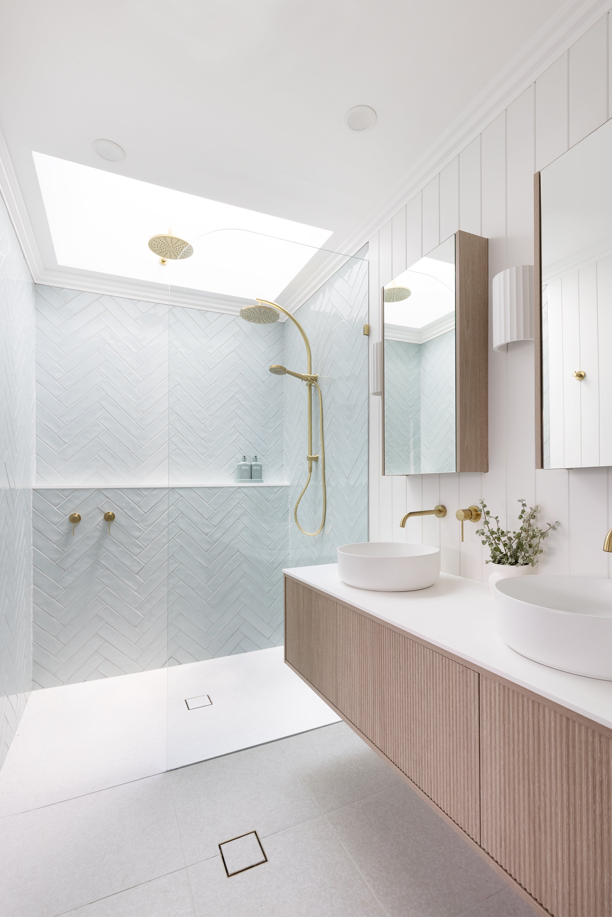 The soft blue hue of the tile used on the shower walls sets the tone for all the other finishes in the bathroom. Crisp white paint on the existing ceilings further lightens and brightens the entire space. Finally, the soft golds of the tapware perfectly complement the subtle blues and whites, creating the coastal luxe atmosphere our client desired.