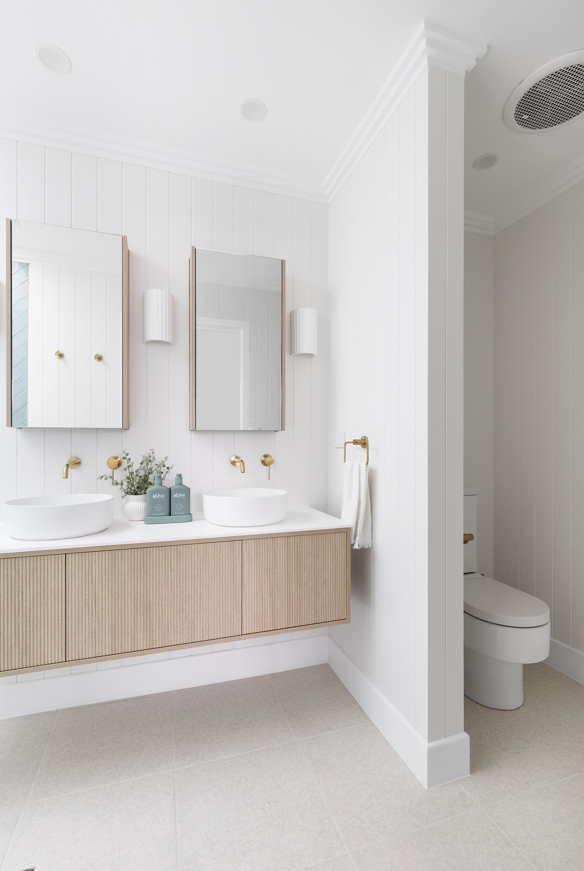 We love incorporating texture into any bathroom space, and for this project, we introduced this stunning ADP Clifton Off-the-shelf ribbed front vanity in soft wood tones. Extra wall storage was essential, and we love maximising additional bathroom storage whenever possible. These semi-recessed ADP Muse Mirror Cabinets from The Blue Space were just the right fit. All this paired beautifully with the herringbone tile pattern and semi-exterior VJ panelling on the main wall behind the vanity. To further elevate the design, we added subtle pops of texture with some gorgeous ribbed wall sconces.