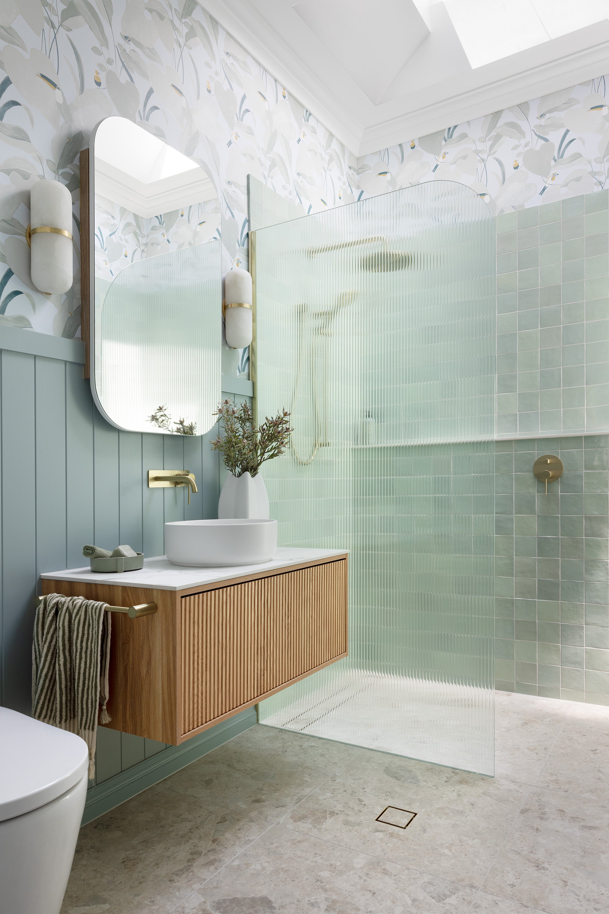 Incorporating VJ wall panelling complemented by whimsical wallpaper to add character and a sense of fun. Warm wood tones, soft ribbed textures, and brushed gold tapware to enhance the welcoming ambiance, while luxurious wall sconces and veined sintered stone introduce a touch of opulence. A bold yet soft paint palette, combined with carefully selected tiles, complete the design, to elevate the spa-like ambiance.