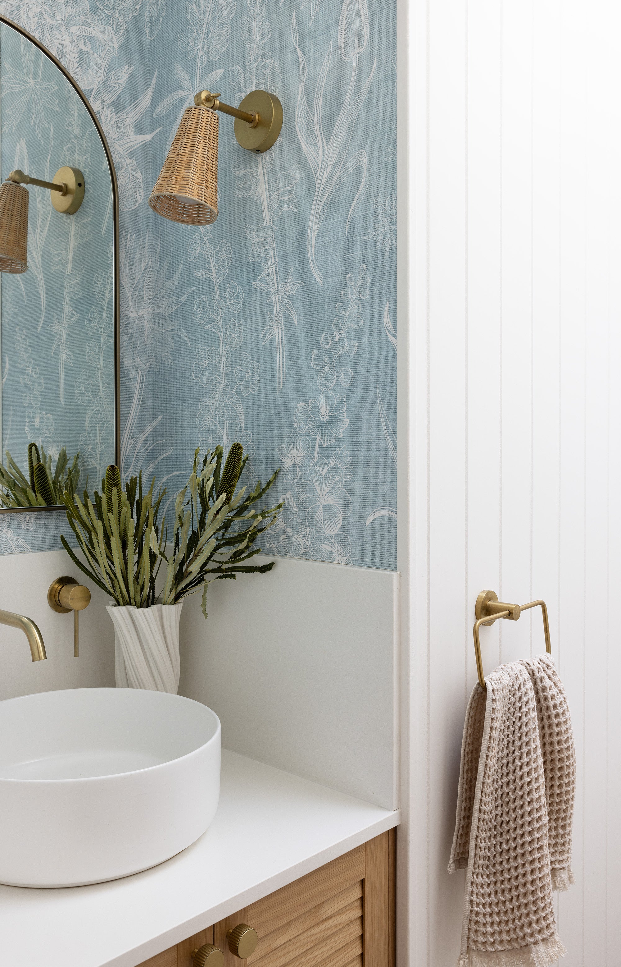 How charming is the rattan and brass wall sconce? We always love incorporating a feature wall sconce into our bathroom renovations, as it truly enhances the space and provides an opportunity for added ambiance beyond standard downlights. In this instance, it introduces an extra layer of texture that beautifully complements the subtle weave of the wallpaper.