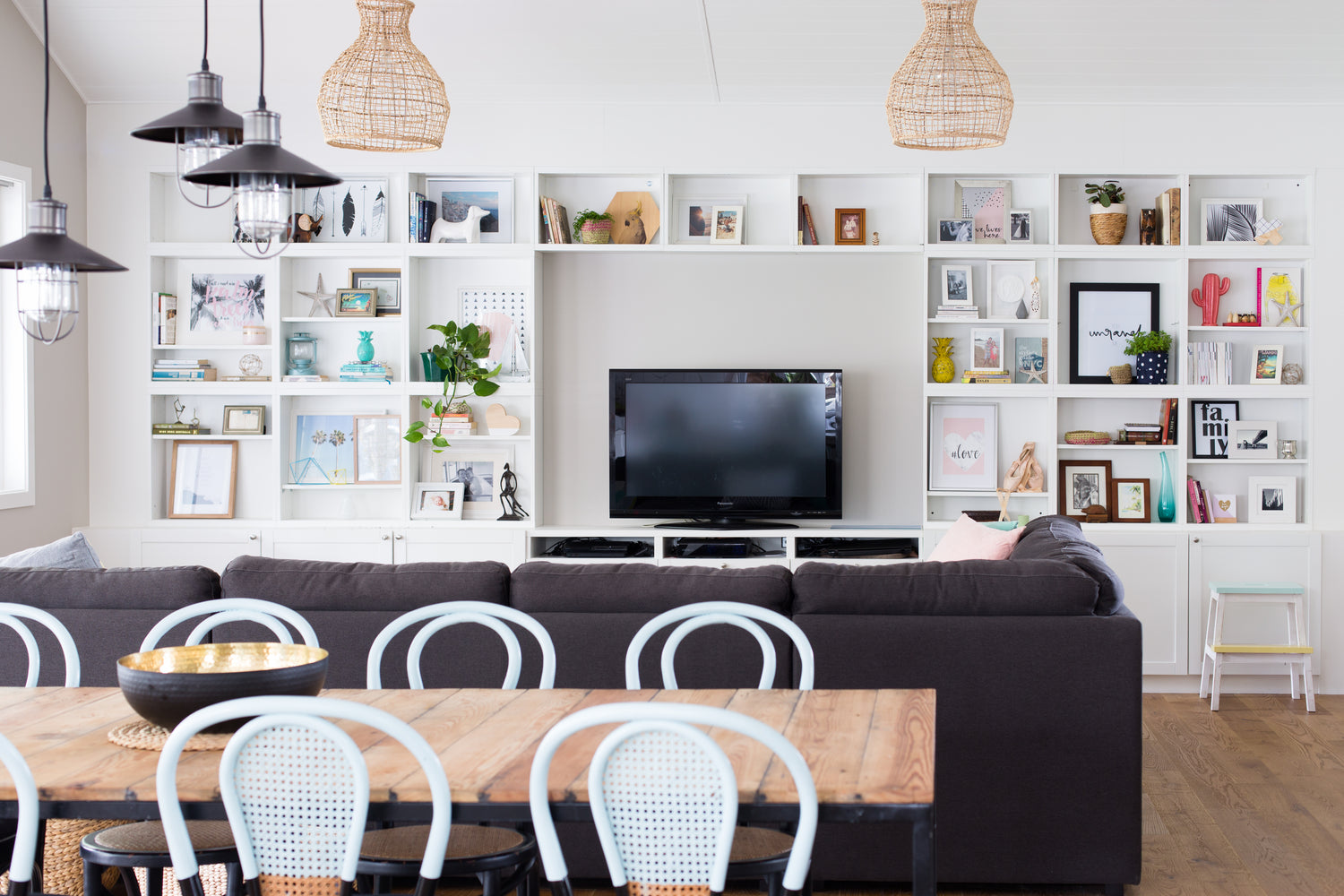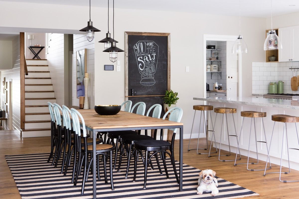 I can remember we custom-built the dining table to fit perfectly in the space (using matte black powder-coated steel & recycled oak that shipped car parts from America to Australia in the '50s). I found it at a demolition yard & instantly fell in love. ❤ My client discovered the old bentwood chairs at a garage sale - we paint dipped them & gave them a new lease on life. Ahh, the mems