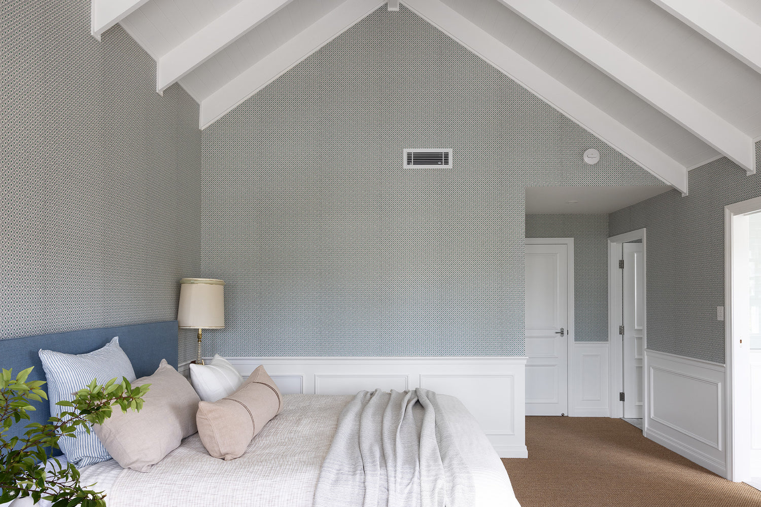 The master bedroom featured some of our favourite go-to signature design details including hand-pitched cathedral ceiling, gorgeous feature window seat, wallpaper and beautiful wainscotting panelling.